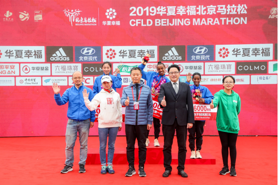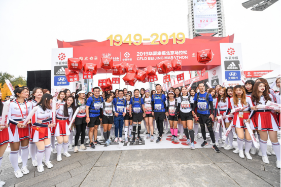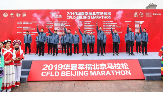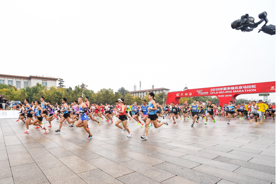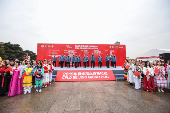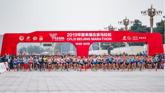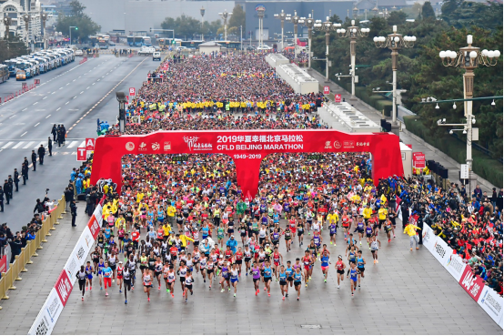 11月3日7时30分,2019华夏幸福北京马拉松于天安门广场前盛大起跑。中国田径协会主席段世杰,国家体育总局副局长高志丹,北京市人民政府副市长张建东,中国田径协会副主席兼秘书长于洪臣,北京市人民政府副秘书长孟钧,中央广播电视总台编务会成员薛继军,中体产业集团董事长王卫东,华夏幸福基业股份有限公司执行总裁吴中兵为赛事鸣枪发令。起跑仪式由国际田联理事、中国田径协会副主席王楠主持。在正式起跑前,所有参赛选手先后合唱《歌唱祖国》、《我和我的祖国》,56个民族代表进行了表演,并与30000名选手共唱国歌。