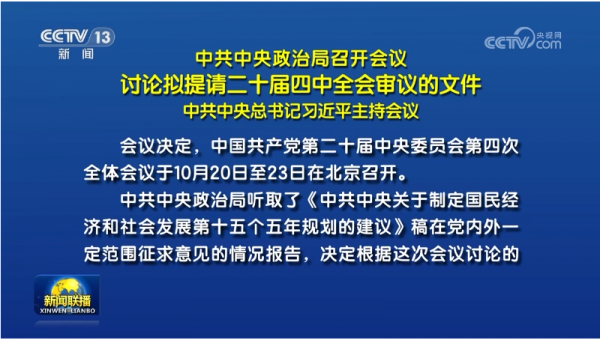 会议决定,中国共产党第二十届中央委员会第四次全体会议于10月20日至23日在北京召开。