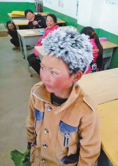 去年初,小满因为头顶着冰霜上学而被称为“冰花男孩”。资料图片