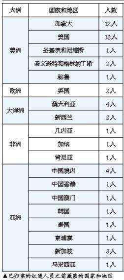 从归案前藏匿的国家或地区来看(人数分布如图表所示),可以看出,美国和加拿大最多,都是12人。但值得一说的是,尚未归案的48人中,也是藏匿在美国和加拿大的人数最多,分别是24人和8人。此外,尚未归案的人当中,藏匿人数较多的国家还有澳大利亚4人、新西兰7人。