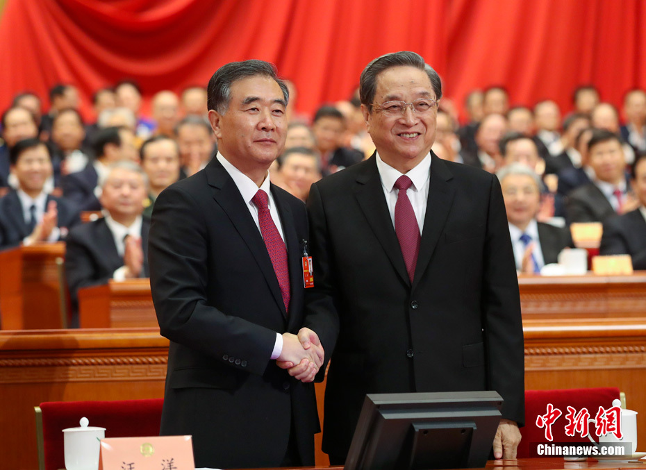 当会议主持人宣布汪洋当选全国政协十三届委员会主席后,全国政协十二届委员会主席俞正声与汪洋热烈握手,全场响起长时间的掌声。