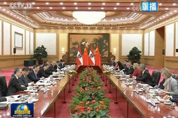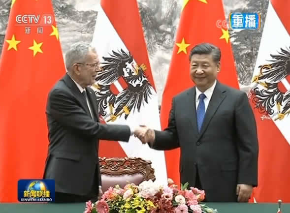 会谈后,双方发表了《关于建立中奥友好战略伙伴关系的联合声明》。两国元首共同见证了“一带一路”合作、司法、创新、交通、现代流通、文化、体育和知识产权等领域双边合作文件的签署。